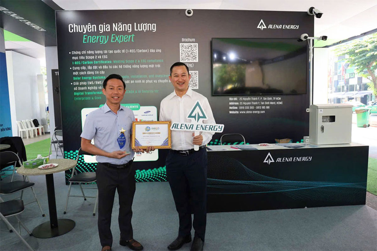 - Tại TP.HCM: Trong khuôn khổ Diễn đàn Kinh tế Mùa thu TP.HCM – sự kiện quy tụ các chuyên gia kinh tế và lãnh đạo cấp cao, Alena Energy đã tham gia Triển lãm Sản phẩm, Dịch vụ Tăng trưởng Xanh (GRECO 2025). Với không gian trưng bày ấn tượng và các giải pháp công nghệ thiết thực, gian hàng Alena Energy đã xuất sắc nhận giải “Outstanding Booth Award” (Gian hàng tiêu biểu) từ Ban tổ chức.