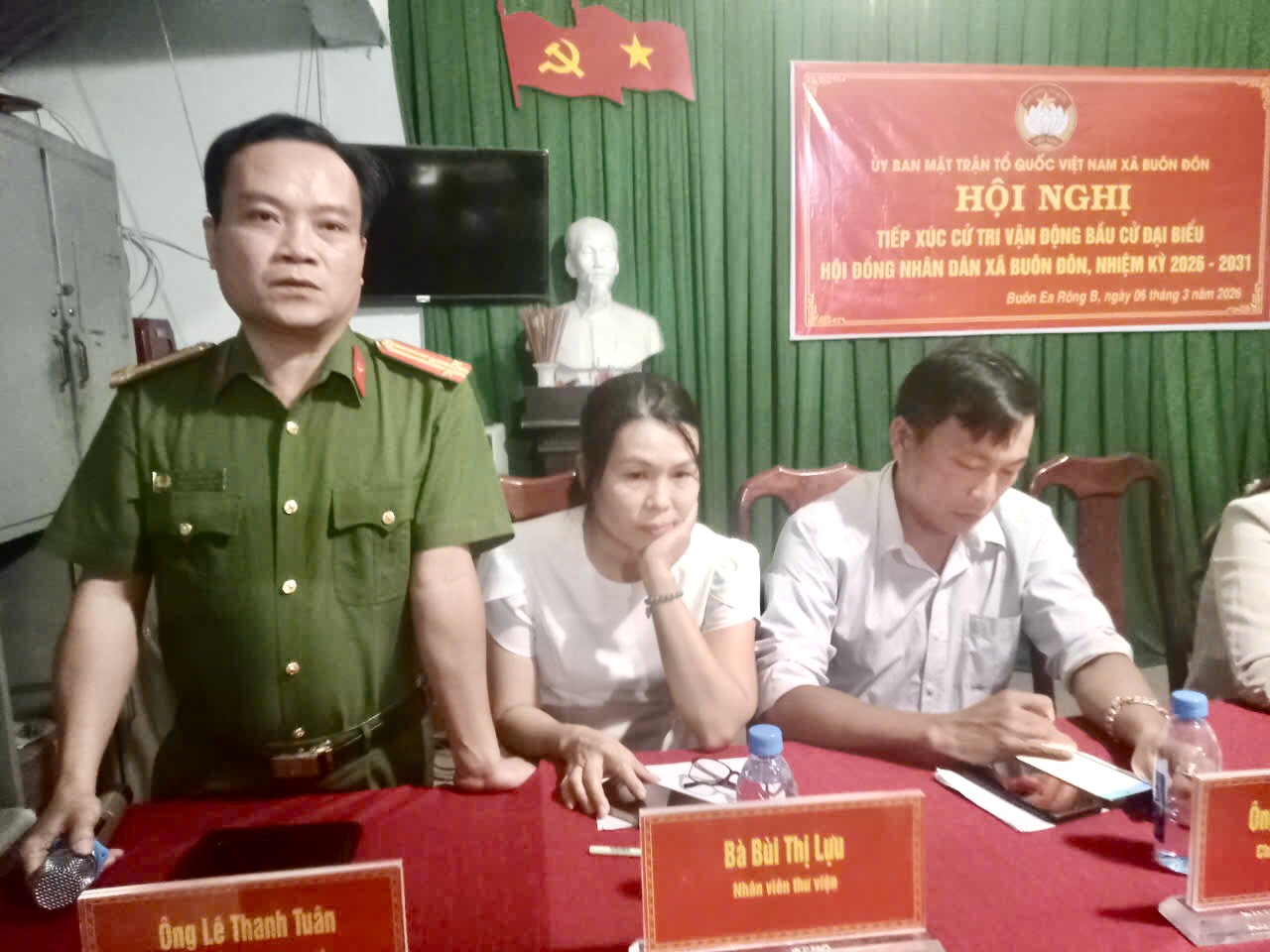 Tham dự hội nghị có đông đảo cử tri tại Buôn Ea Rông B cùng các ứng cử viên đại biểu HĐND xã. Đơn vị bầu cử số 2 gồm các ứng cử viên: bà Phan Thị Chi, Bí thư thôn Thống Nhất; ông Nguyễn Công Dũng, Bí thư Đảng ủy, Chủ tịch HĐND xã Buôn Đôn; ông Lê Thanh Hải, Trung tá Công an xã Buôn Đôn; bà Lưu Thị Hằng, chuyên viên Phòng Văn hóa – Xã hội xã; ông Đỗ Tuyên Hoàng, chuyên viên Phòng Kinh tế; bà Bùi Thị Lựu, cán bộ văn thư Trường Võ Thị Sáu; ông Lê Thanh Tuân, Thượng tá, Trưởng Công an xã Buôn Đôn.