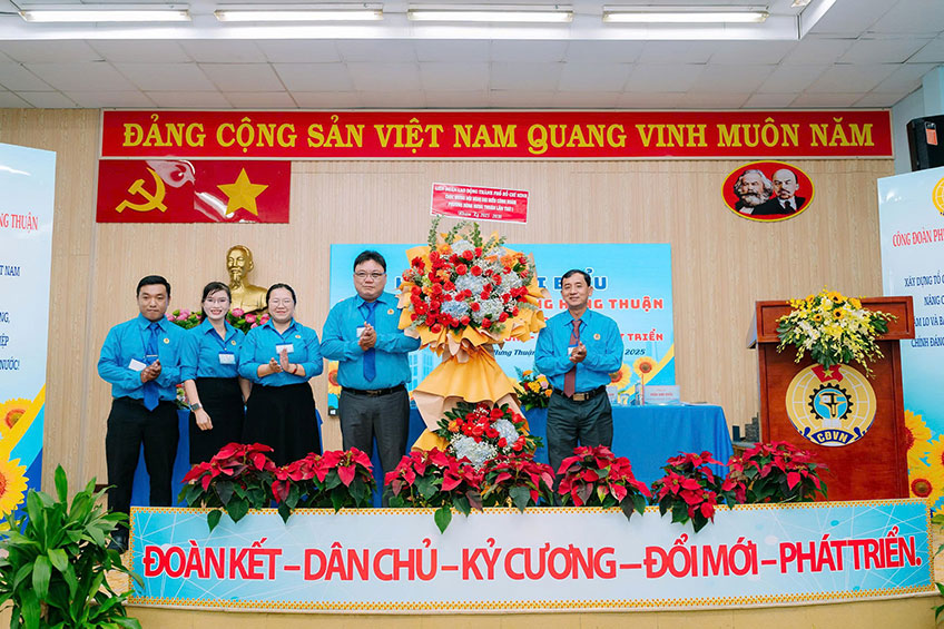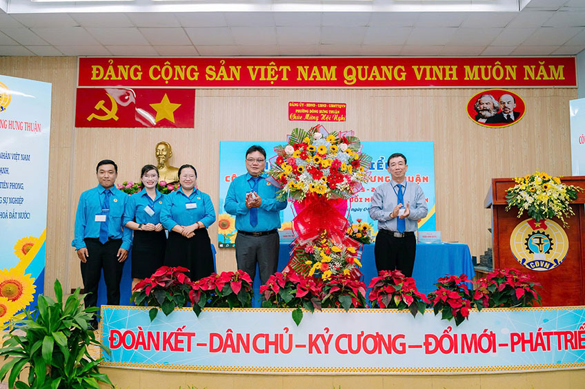 Đến dự và tặng hoa chúc mừng Hội nghị Đại biểu có đồng chí Huỳnh Thanh Tuấn – Ủy viên BTV LĐLĐ TP.HCM; đồng chí Võ Kim Ngọc – Ủy viên BTV Đảng ủy, Trưởng Ban xây dựng Đảng phường Đông Hưng Thuận; đồng chí Nguyễn Thị Ngoãn – Ủy viên BTV Đảng ủy, Chủ tịch Ủy ban MTTQ Việt Nam phường Đông Hưng Thuận; cùng 100 đại biểu ưu tú đại diện cho 213 Công đoàn Cơ sở với hơn 14.548 đoàn viên công đoàn trên địa bàn phường.