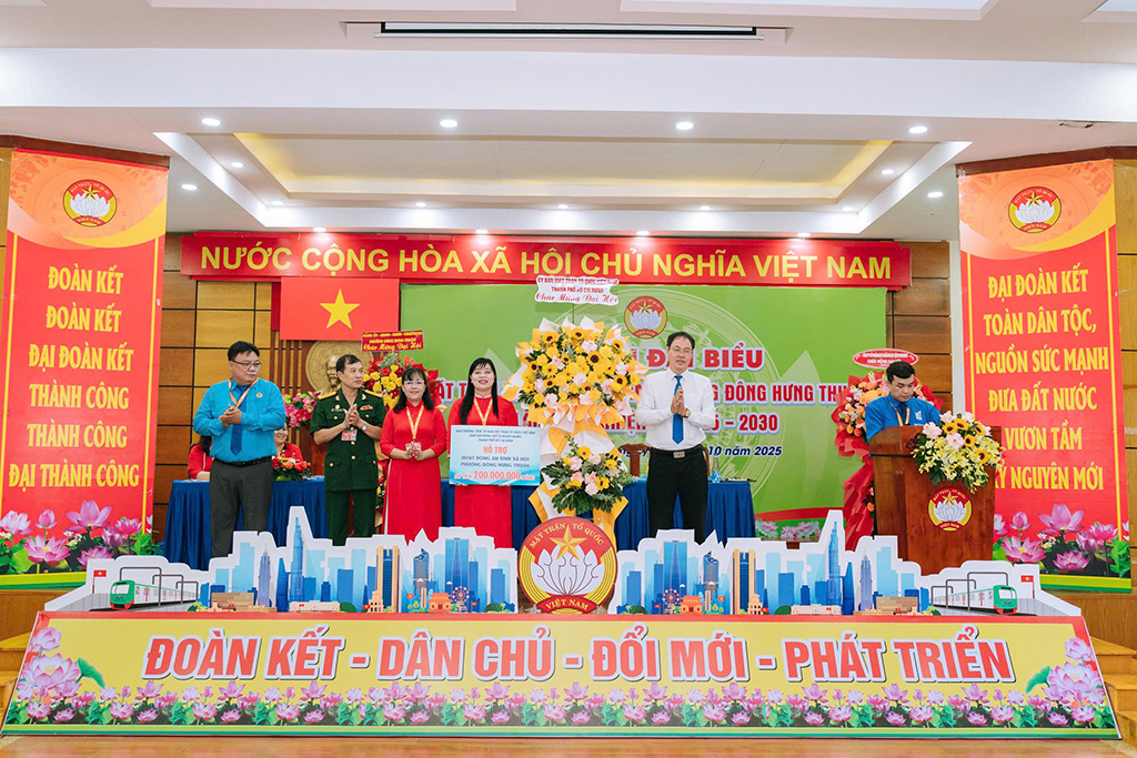 Lãnh đạo Ủy ban MTTQ Việt Nam TP.HCM tặng hoa chúc mừng Đại hội và trao biển hỗ trợ 200 triệu đồng cho hoạt động an sinh xã hội phường Đông Hưng Thuận