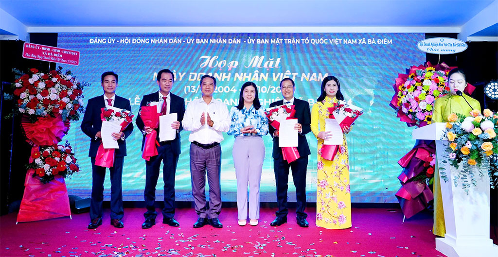 Buổi họp mặt diễn ra trong không khí trang trọng, ấm cúng, thể hiện sự quan tâm, đồng hành của chính quyền xã với cộng đồng doanh nhân, đồng thời khẳng định vai trò quan trọng của doanh nghiệp trong sự phát triển bền vững của xã Bà Điểm. Để chương trình diễn ra thành công tốt đẹp, Ban Tổ chức trân trọng vinh danh các nhà tài trợ; bà Phùng Thị Nguyệt – Phó TGĐ Công ty HT GAS tài trợ Kim Cương; ông Đỗ Văn Thiện và ông Trần Quốc Tuấn tài trợ Vàng; ông Vũ Hồng Anh, ông Nguyễn Thành Tòng và ông Nguyễn Kim Tuấn tài trợ Bạc.