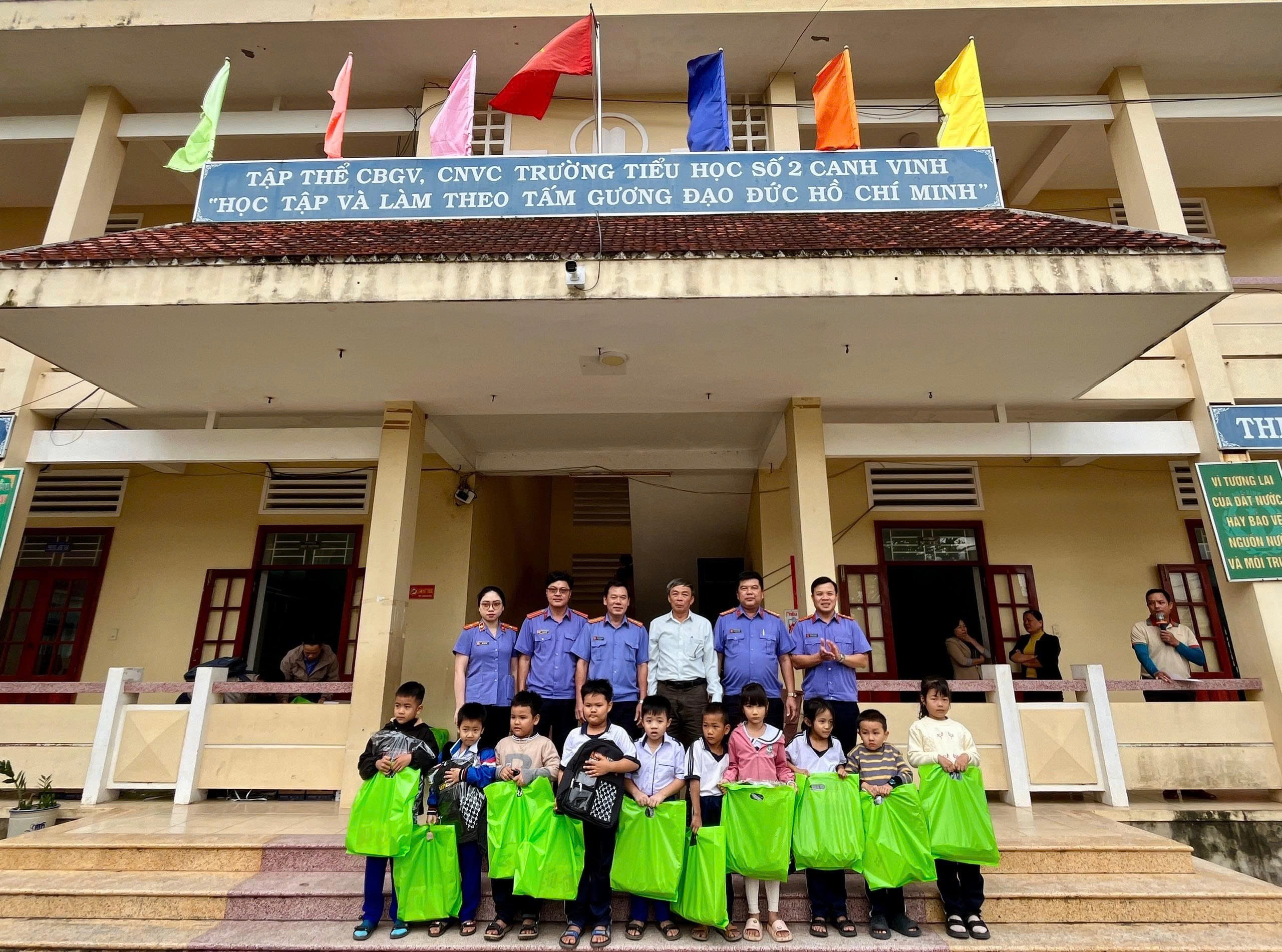 Đại diện Lãnh đạo VKSND tỉnh Gia Lai và đoàn công tác trao tặng cặp sách, quà cho các em học sinh tại Trường Tiểu học số 2 Canh Vinh.