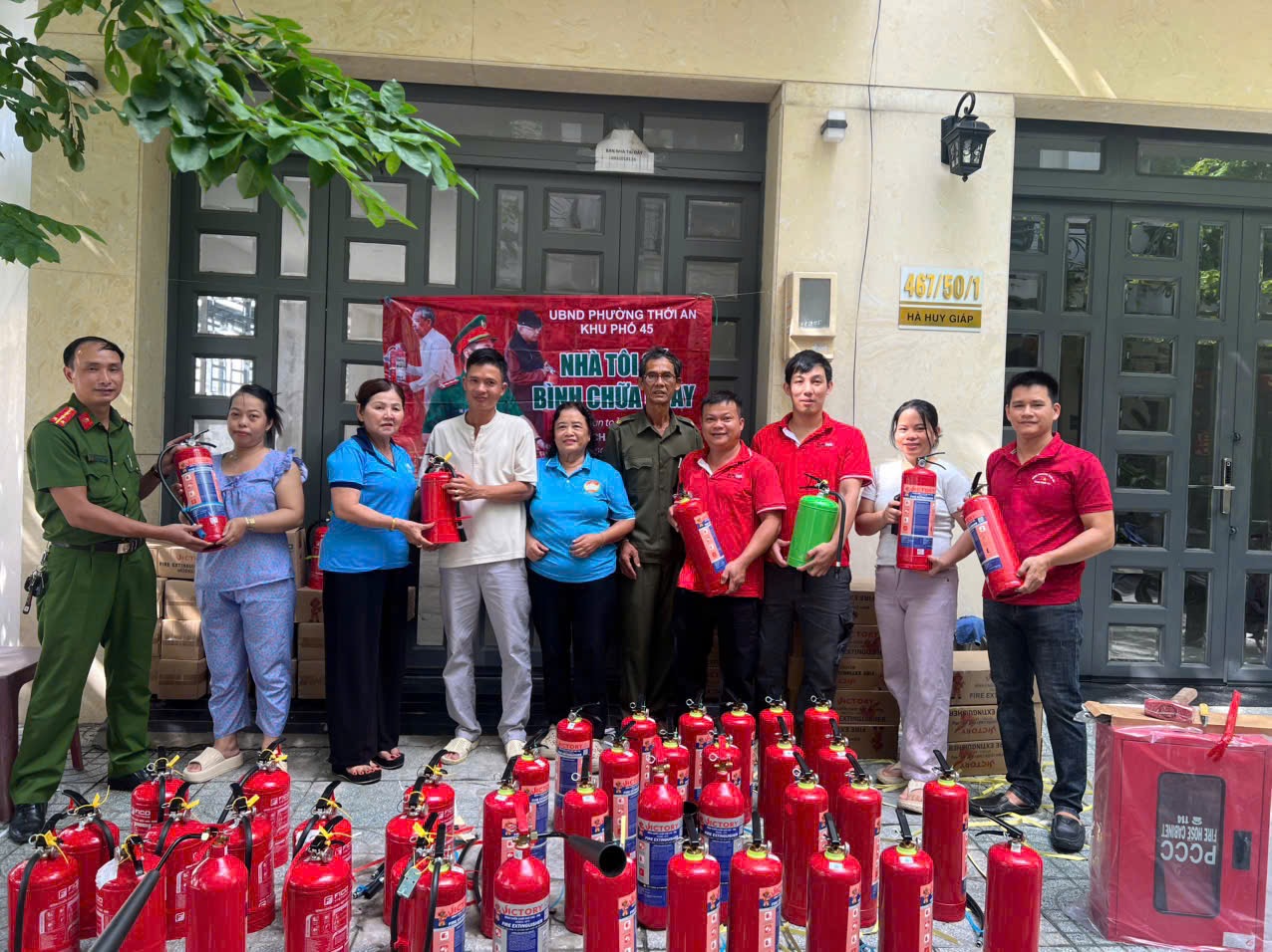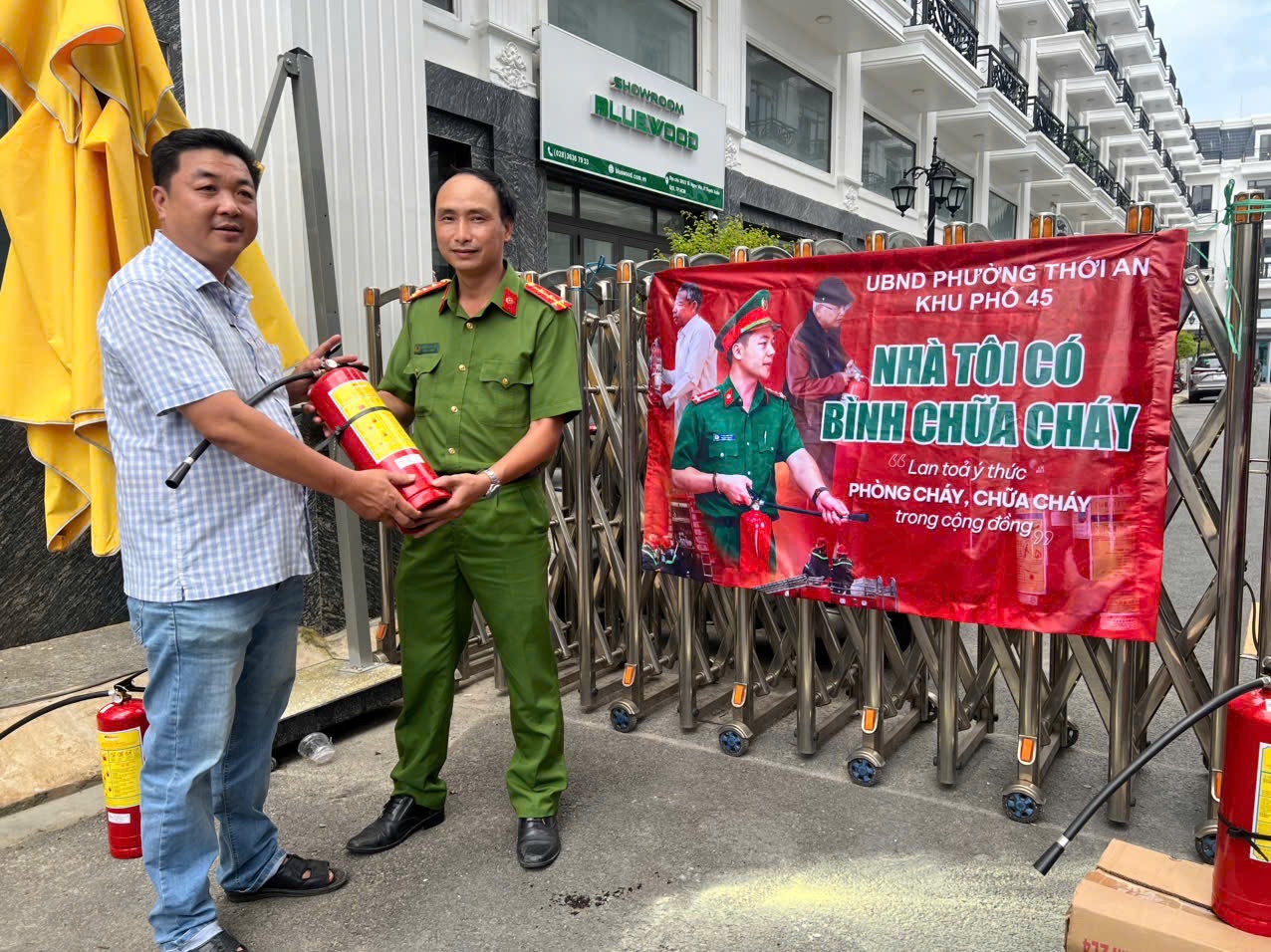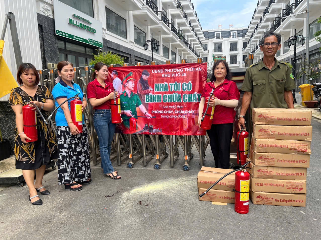 Tại lễ ra quân, đồng chí Nguyễn Đình Tuấn (Cảnh sát khu vực), ông Vũ Văn Hiệu Trưởng khu phố và đồng chí Nguyễn Văn Bé Sáu Bí thư chi bộ Khu phố 45 đã cùng lực lượng an ninh cơ sở trực tiếp vận động, hướng dẫn và trao tặng hơn 120 bình chữa cháy cho các hộ dân. Không chỉ dừng lại ở việc trao thiết bị, các cán bộ, chiến sĩ còn tận tình hướng dẫn người dân cách sử dụng bình chữa cháy thành thạo, đảm bảo khi có sự cố bất ngờ xảy ra, mỗi người dân có thể trở thành “người lính phòng cháy” bảo vệ gia đình và hàng xóm.