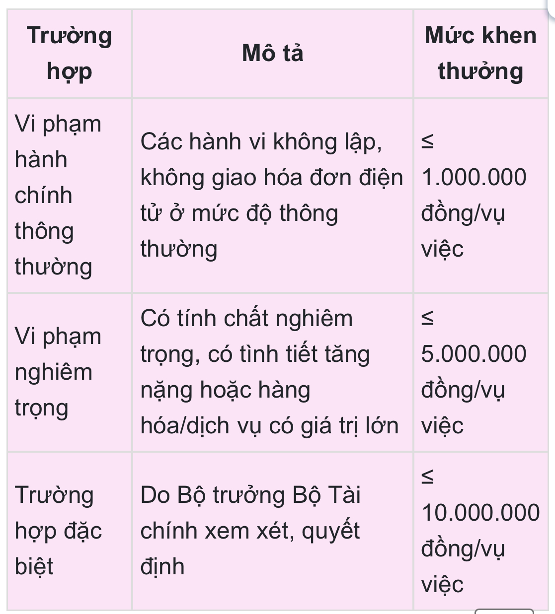 Trường hợp vi phạm hành chính thông thường, mức thưởng tối đa không quá 1 triệu đồng/ vụ việc. Nếu vi phạm có tính chất nghiêm trọng, có tình tiết tăng nặng hoặc có giá trị hàng hóa, dịch vụ lớn, mức thưởng tối đa không quá 5 triệu đồng/vụ việc.